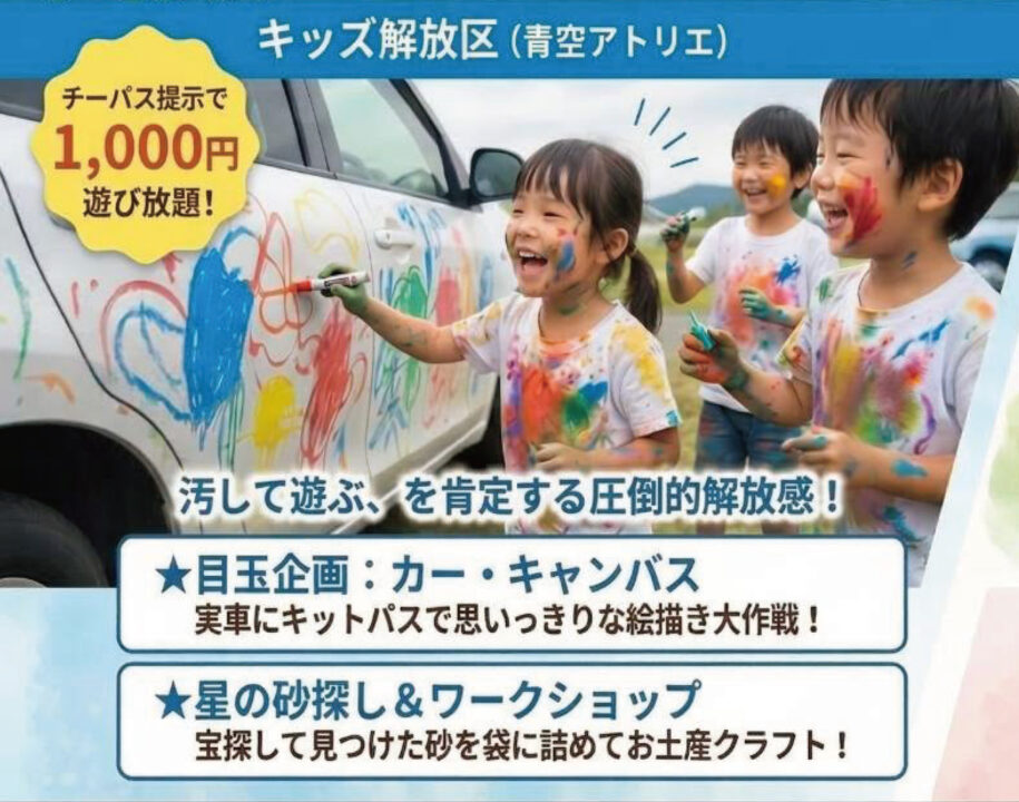 実車をキャンバスに見立て、キットパス等で自由にお絵描きができる目玉企画です。フィナーレには「ウォーター・クリーン大作戦」として、水鉄砲やスプレーで絵を洗い流すイベントを実施し、片付けまでをエンターテインメント化します。