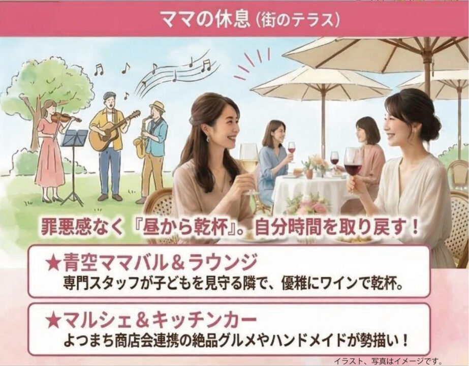 ・飲食提供:キッチンカーによるフード提供に加え、商店会連携によるアルコール(ワイン、カクテル等)およびソフトドリンクを提供します。